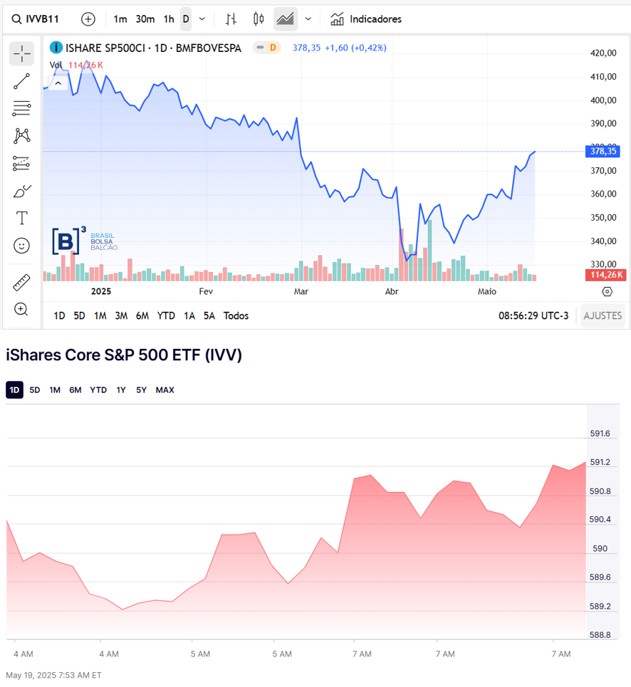 Fontes: https://www.b3.com.br/pt_br/market-data-e-indices/servicos-de-dados/market-data/cotacoes/?tvwidgetsymbol=BMFBOVESPA%3AAFHI11 – em 19/05/2025, às 10:04am. | https://www.nasdaq.com/market-activity/etf/ivv – em 19/05/2025, às 10:04am.